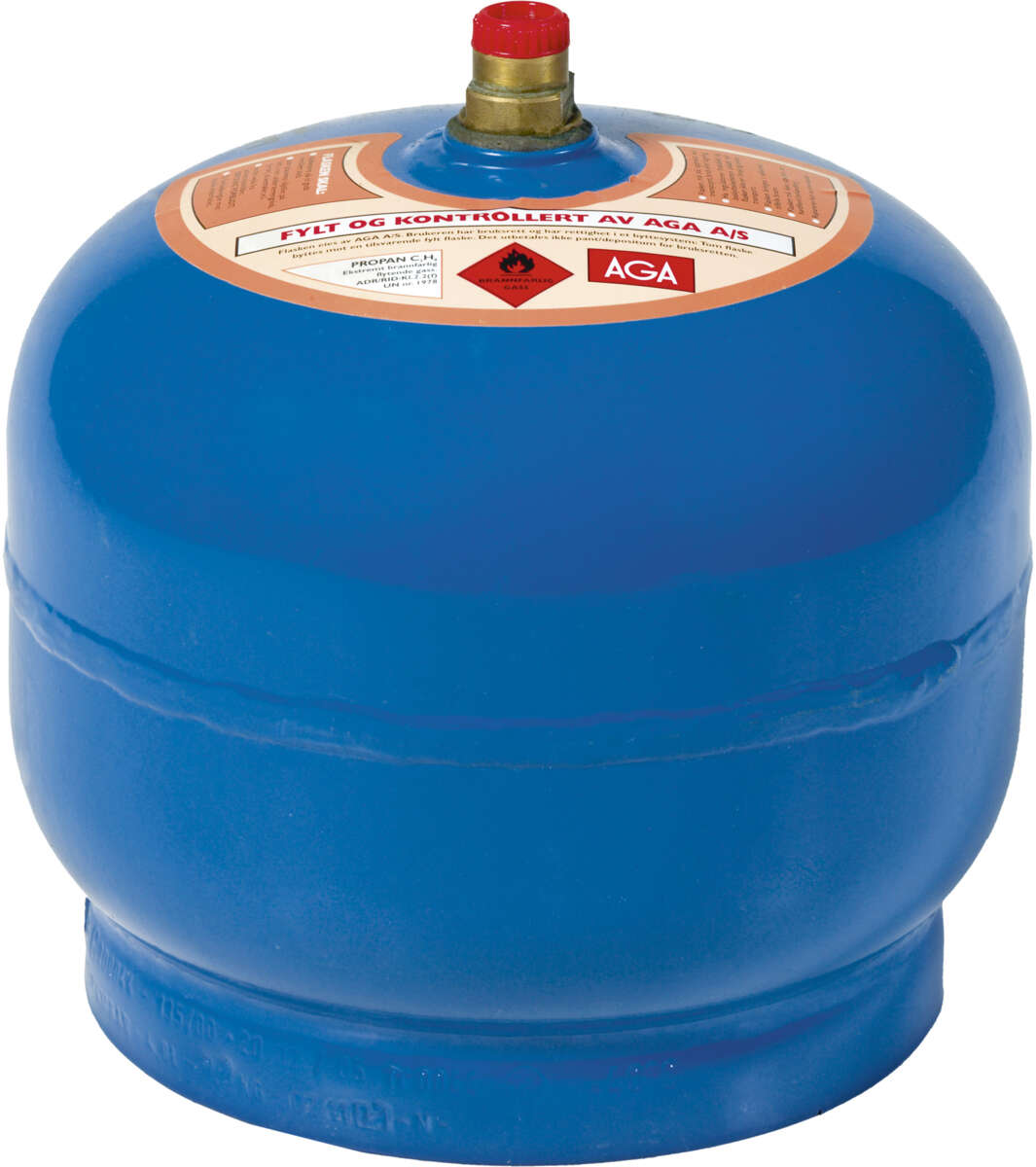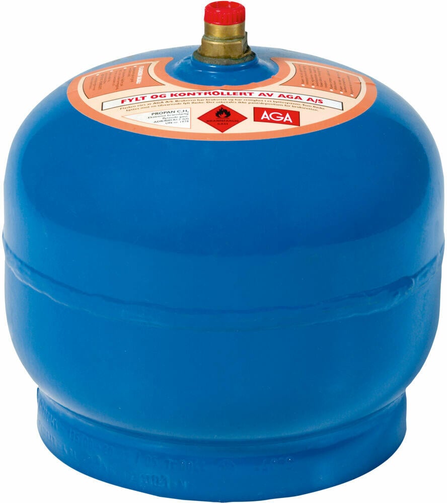 Aga stålflasker fås i ulike størrelser. Fås med husholdningsventil (click-on)