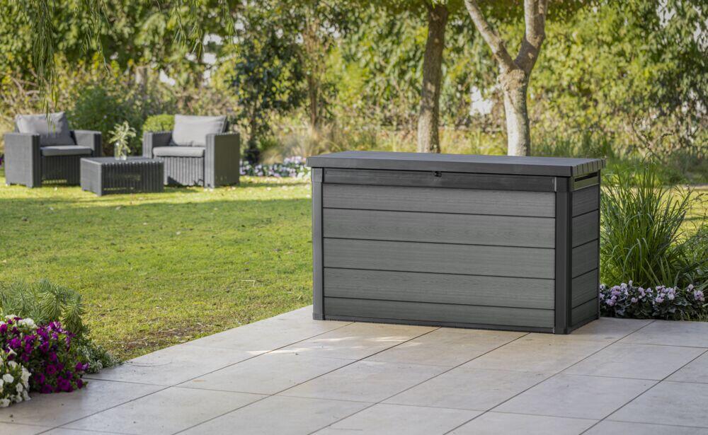 Cortina putekasse har et trelignende utseende og er laget av kompositt som er værbestandig og UV-beskyttet. Denne kassen holder alt du måtte ønske å ha i den tørt, og har en meget godi åpne-/lukkemekanismen i lokket. Lokket er dessuten vanntett og låsbart.
