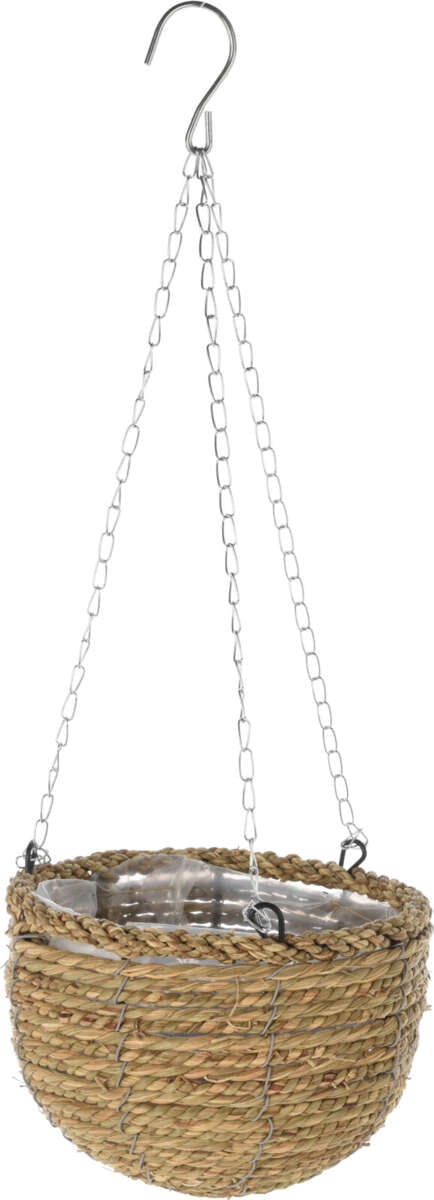 Bast, med plastfolie i potten og metall oppheng.
