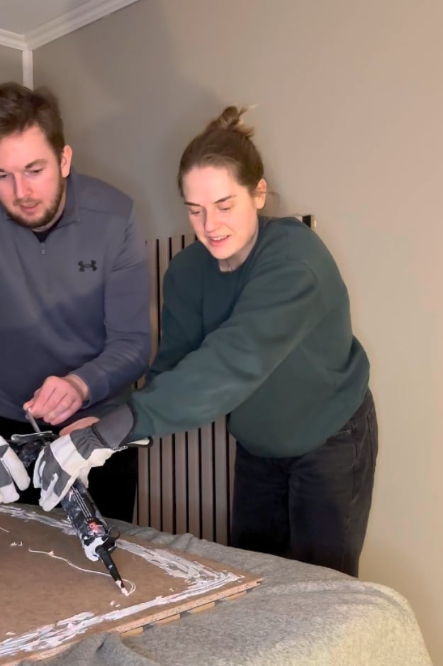 6. Løft spileplata med lim slik den skal stå mot veggen og på riktig mål som er merket opp. Vær to slik at dere kan dobbeltsjekke målene. Skyv plata inn mot veggen og legg press på den, spesielt på hjørnene. Stå gjerne i noen minutter for å sørge for at plata holder. Det kan hende den løsner litt, men da er det bare å presse lenger.