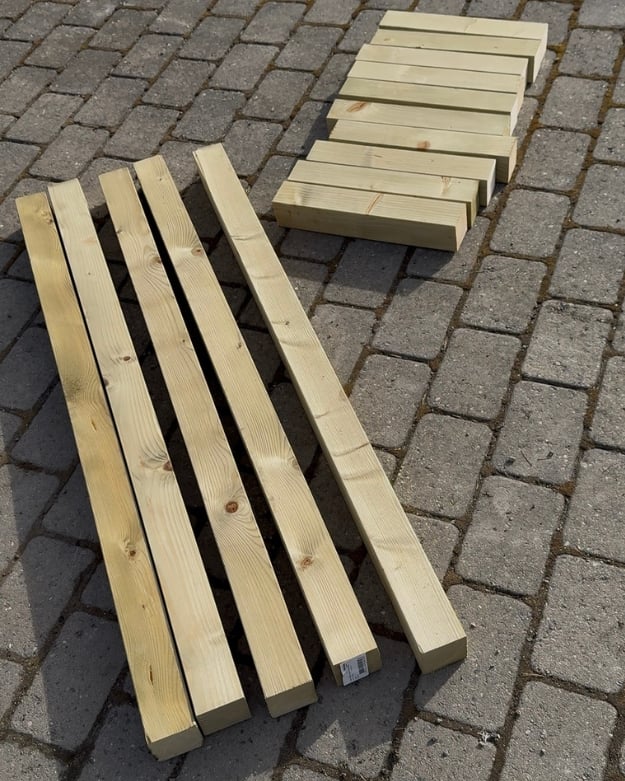 2. Skru sammen de lange gjerdestolpene til en sitteplate ved å skru en og en stolpe sammen med lange skruer.