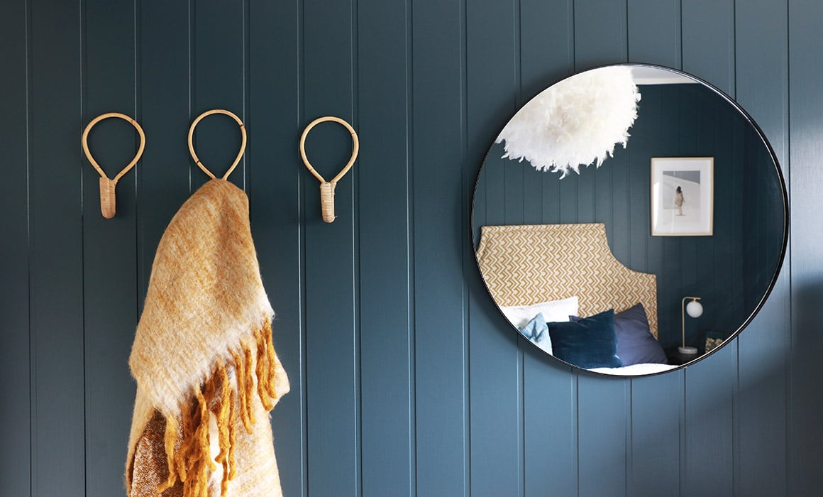 Trine var i utgangspunktet litt skeptisk da interiørstylist Annette foreslo blå vegger, men ble raskt omvendt. Basic Wall fra Huntonit i fargen Deep Ocean ga Trine soverommet hun alltid har drømt om – på rekordtid!