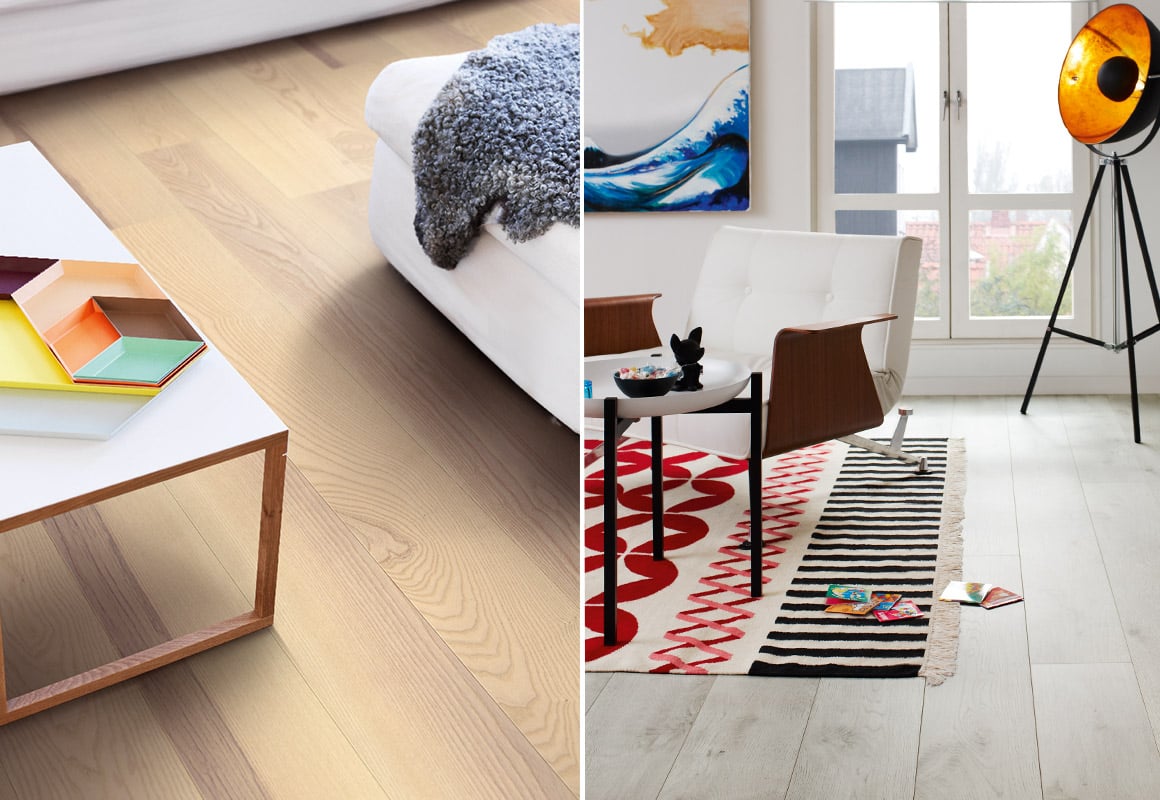IKKE STOR FORSKJELL: Det kan være vanskelig å se forskjell på parkett- og laminatgulv. Her er det gulvet til venstre som er laminat, mens det på bildet til høyre er parkett.