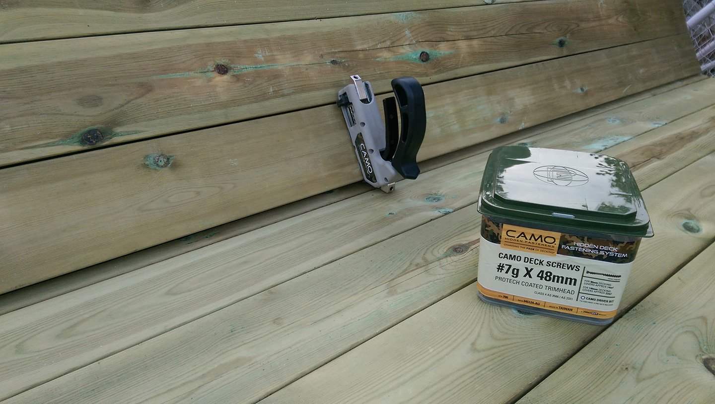 Camo er et system som hjelper deg å feste skruer skrått og skjult i alle typer terrassebord. Redskapet er en mal som sørger for at vinkelen blir riktig, og at de tilpassede skruene ikke lager sprekker i treverket. Systemet består av skrumaler, avstandsklosser, bor, bits og freseskruer.