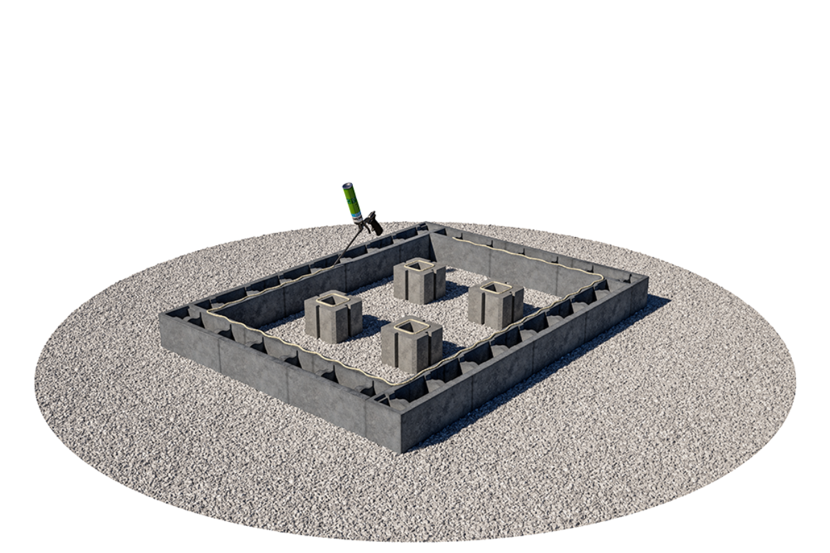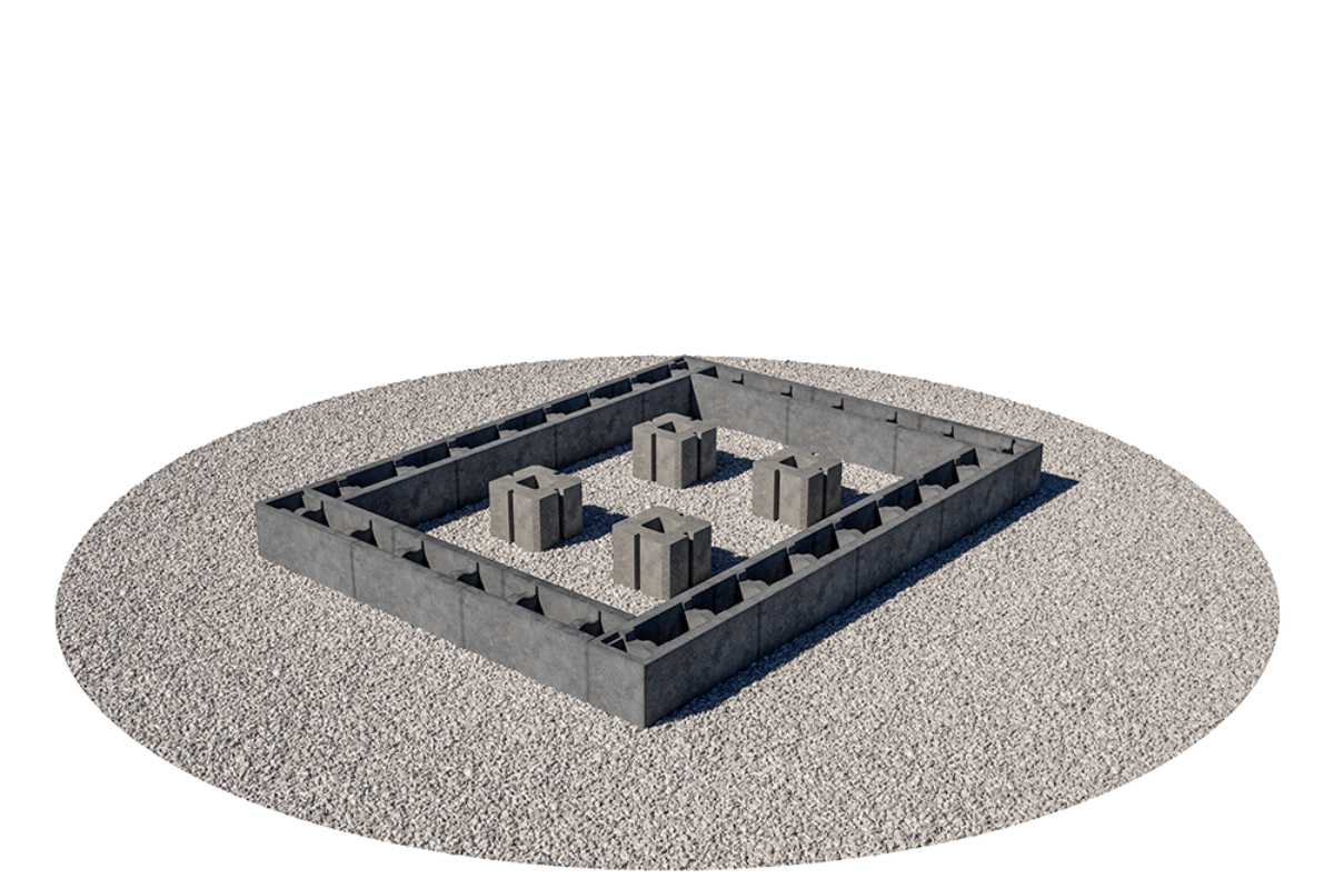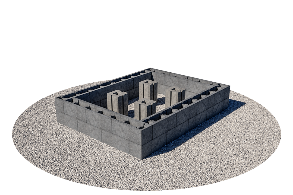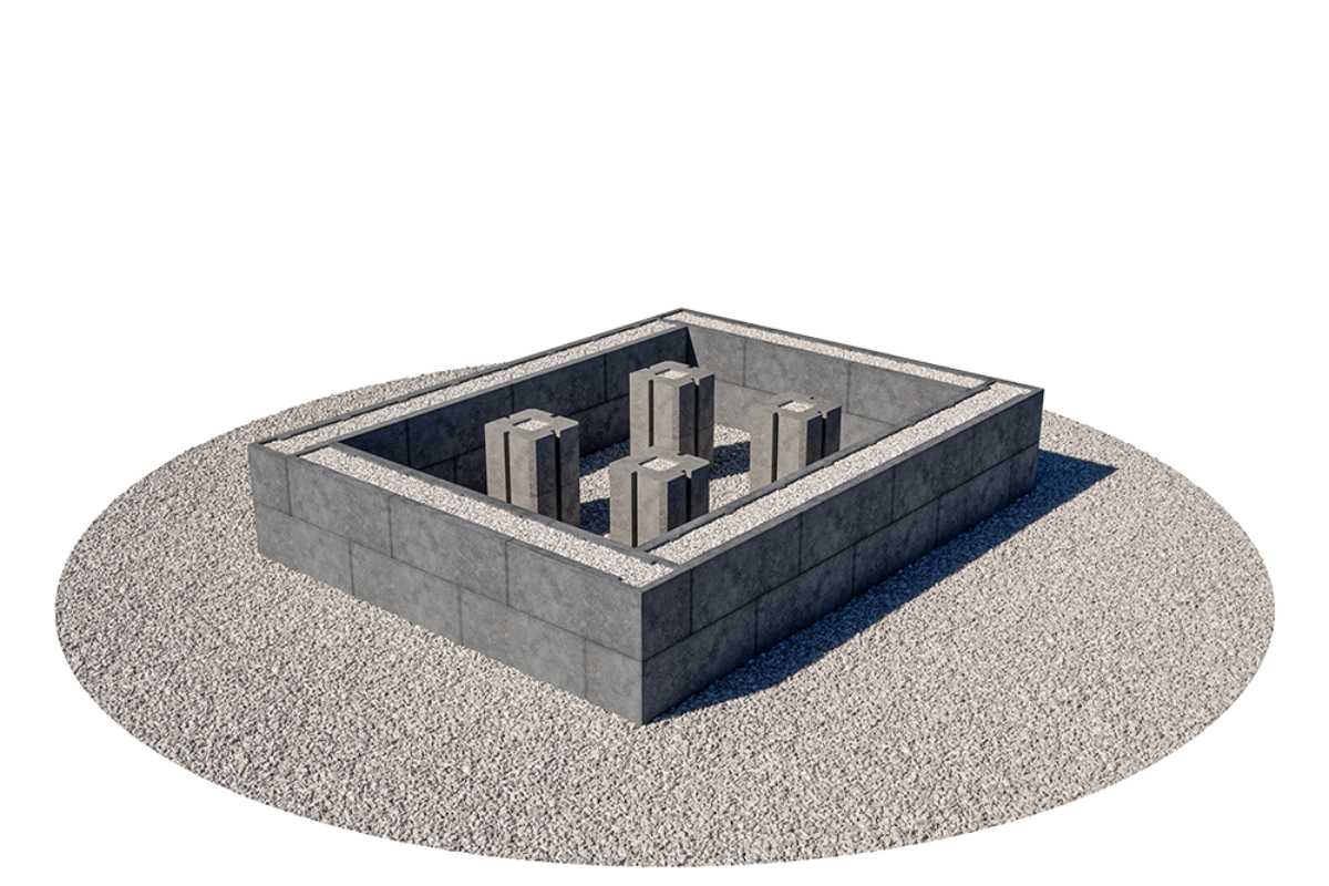 Sørg for riktig drenering og anlegg en såle av pukk. Komprimer sålen grundig og bruk gjerne 8-22mm knust masse som avrettingslag. Begynn å stable blokkene direkte på den avrettede sålen. Sett første skift i jordfuktig betong. Det er avgjørende for resultatet at underlaget er rett og at det første skiftet er i vater (begge veier). Sjekk med vater for hvert skift du bygger.