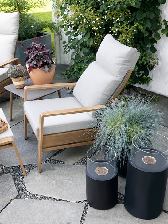 Stilfulle lykter og utepeiser skaper en varm og lun atmosfære og er samtidig et lekkert blikkfang.