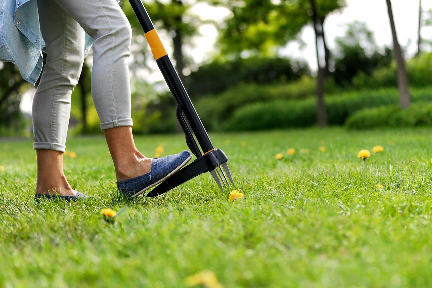 På flerårig rotugress er det svært viktig å få hele roten opp, slik at planten ikke kan vokse videre. Det gjør du raskest og mest effektivt med en mekanisk ugressfjerner med langt skaft, som Xact Weeder fra Fiskars.