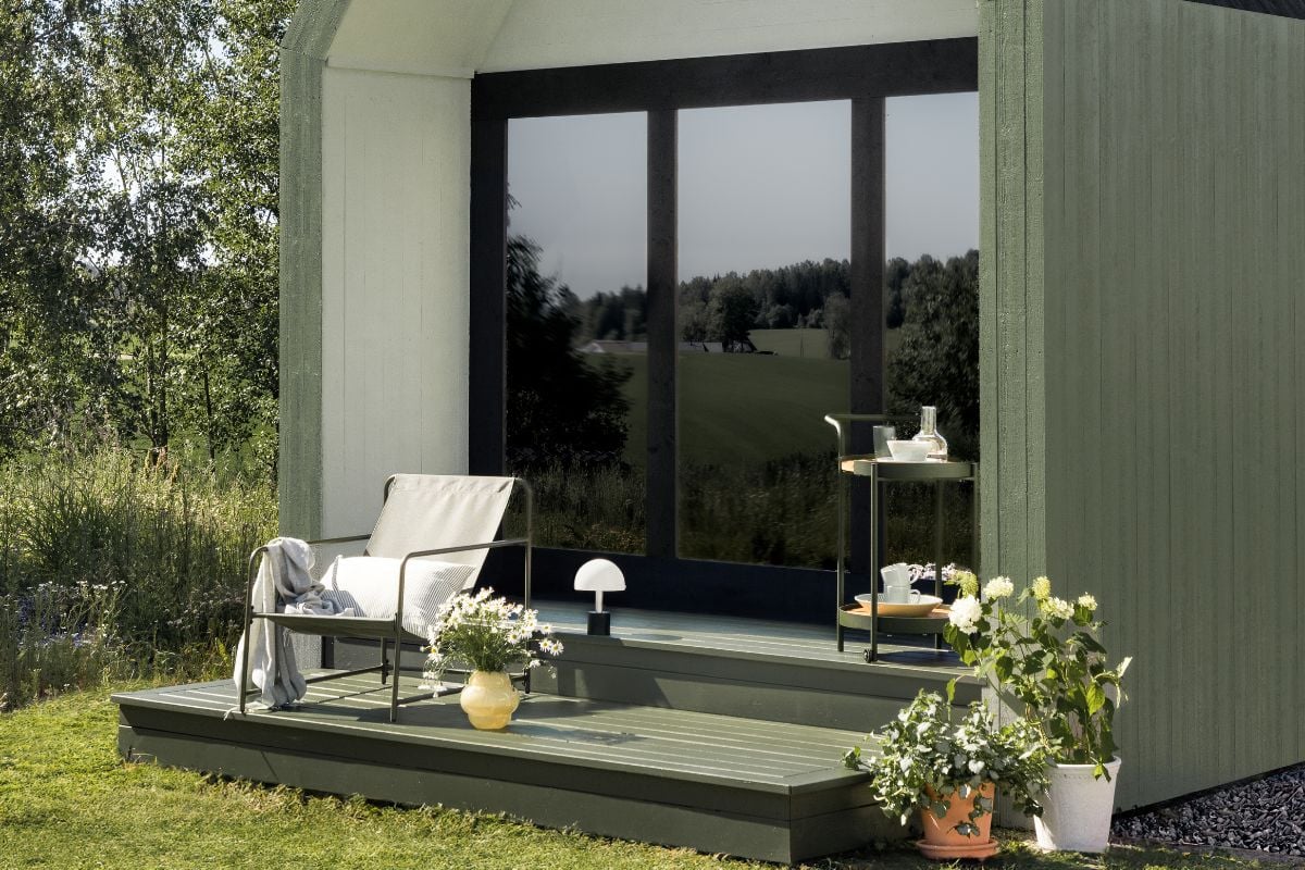 Det er spennende å eksperimentere med ulike nyanser av grønt. På bildet under ser du en kombinasjon av fargene 0983 Barnål på terrassegulvet, 5733 Opal innvendig og 0999 Aftendugg utvendig – en sammensetning som gir en elegant og naturlig helhet.