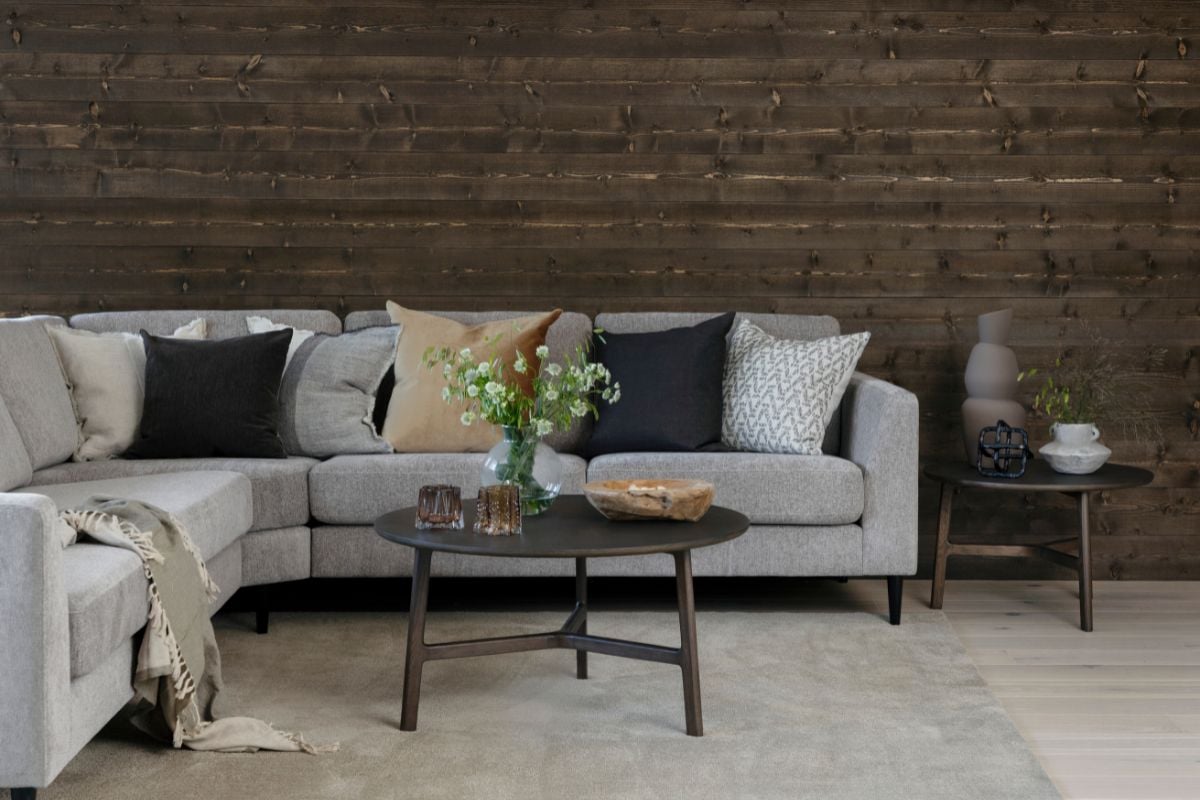 I bildet nedenfor ser du en stue hvor Tyrilin har satt opp eksteriørpanel på en vegg. Det virker kanskje litt pussig? Men se så tøft og livlig treverket ble. Fordi eksteriørpanelet ikke er høvlet, trekker beisen dypere inn og skaper markante kontraster mellom kjerneved, grovere treverk og glatt treverk. Det gjør veggen til et blikkfang. Tyrilin valgte her å bruke Tyrilin Interiørbeis i fargen Kongle. Dette er en varm, brun farge som gir en fantastisk spennende stue!