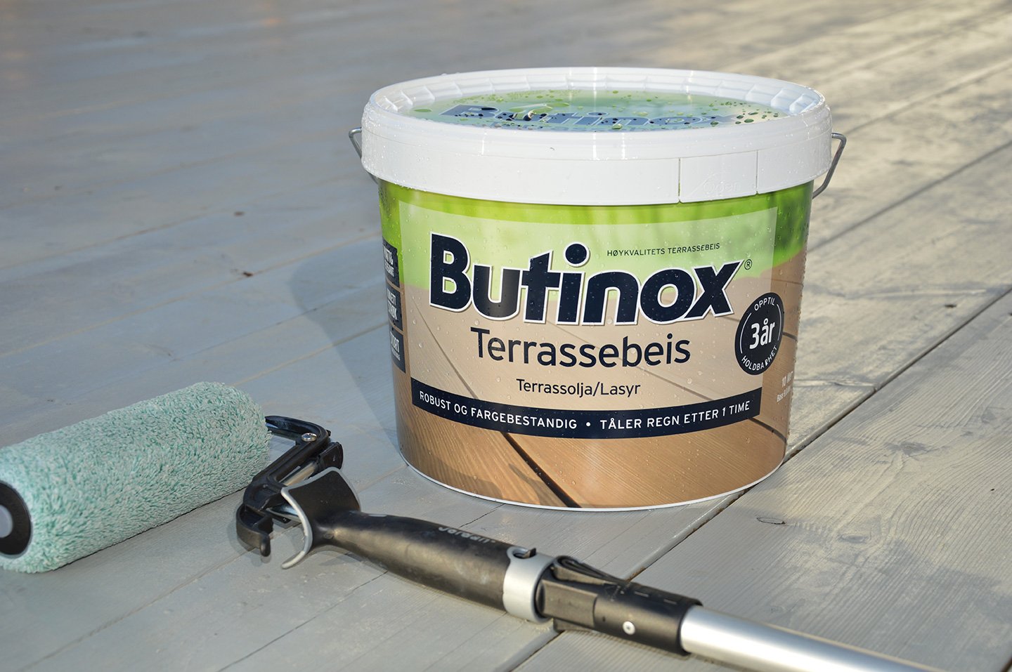 –Den nye og forbedrede terrassebeisen fra Butinox tåler nemlig en regnskur allerede èn times tid etter påføring, forteller kategorisjefen. Selve beisingen må riktignok foregå i oppholdsvær på tørre gulvbord.