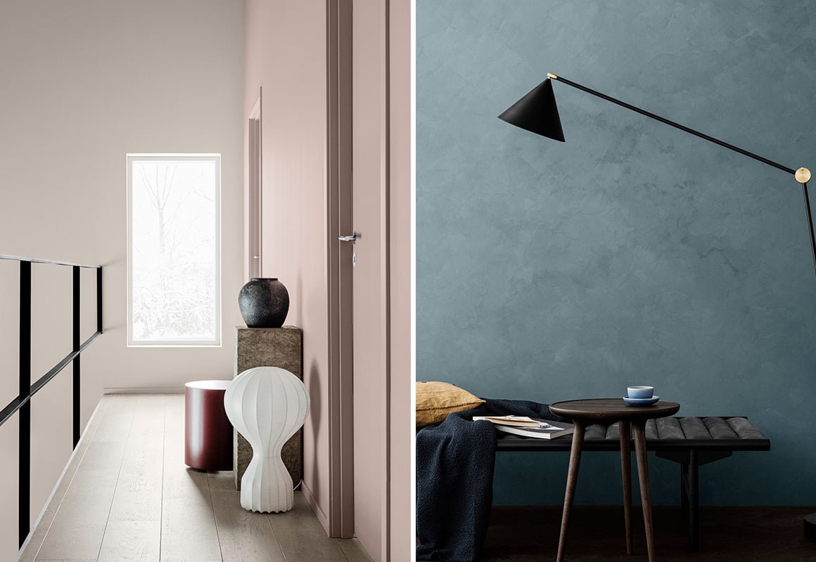 TIL VENSTRE er dør og lister malt i samme nyanse som veggen, 20054 sSilky Pink. Til høyre ser du Lady Minerals i 5044 Icy Blue. (Foto: Line Klein/Jotun A/S / Lady)