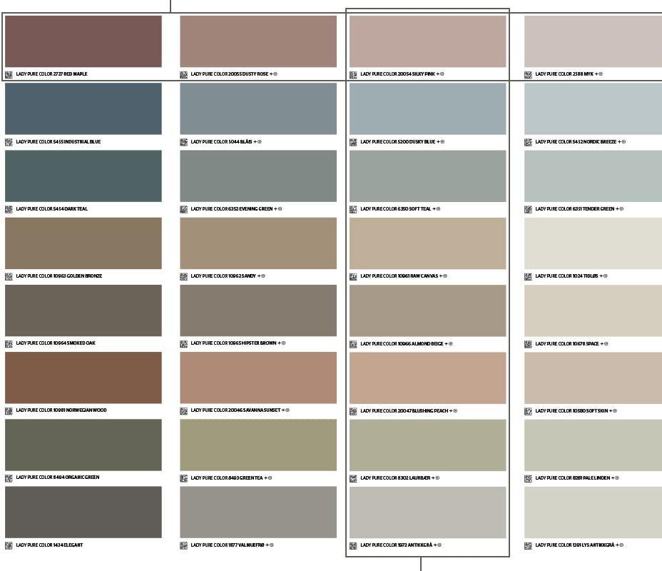 24 av de nye fargene kan også blandes i kalkmalingen Lady Minerals og i takmalingen Lady Perfection. For en lun følelse i rommet, kan du male taket i samme farge som veggene.