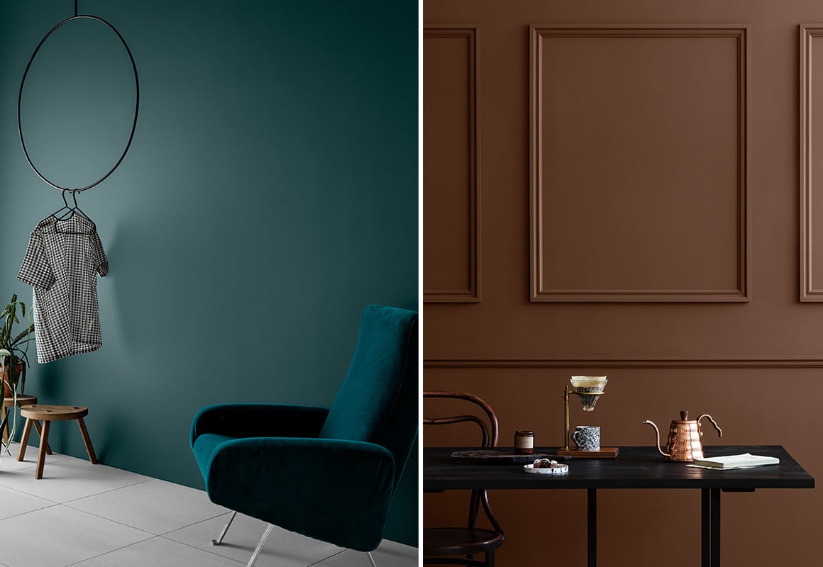 DEMPET OG DELIKAT: Selv helt mørke farger som 5454 Dark Teal og 10981 Norwegian Wood blir ikke for mye når nyansene er så elegante. (Foto: Line Klein/Jotun A/S / Lady)