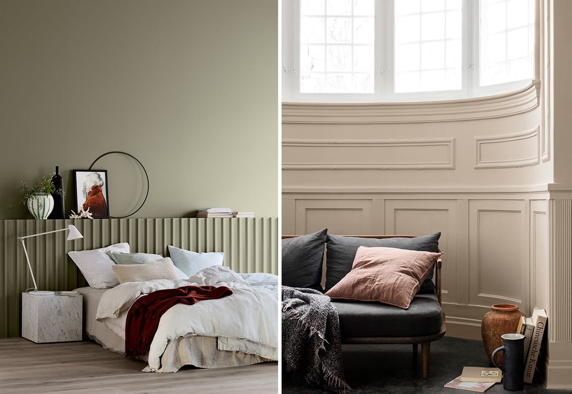 DUSE FARGER: Du vil ikke savne hvite vegger – vi lover! Fargen til venstre er 8302 Laurel, til høyre ser du 10580 Soft Skin. (Foto: Line Klein/Jotun A/S / Lady)