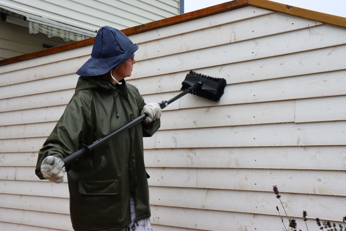 - Start med å vaske huset for å fjerne pollen, overflatesopp, smuss og skitt fra overflaten. Påfør rengjøringsmiddel beregnet for fasaden med en lavtrykksprøyte og skrubb godt. Jordan superkost gjør fasadevasken enklere og gjør at du kommer til i alle kriker og kroker, sier hun og legger til:
