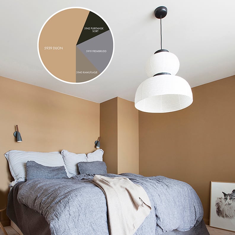 - Bruk veggfarger som går ton-i-ton, f. eks. Dijon og Kamuflasje som du ser i toppbildet. Da deles åpne romløsninger inn i forskjellige soner, og gir en lunere atmosfære.