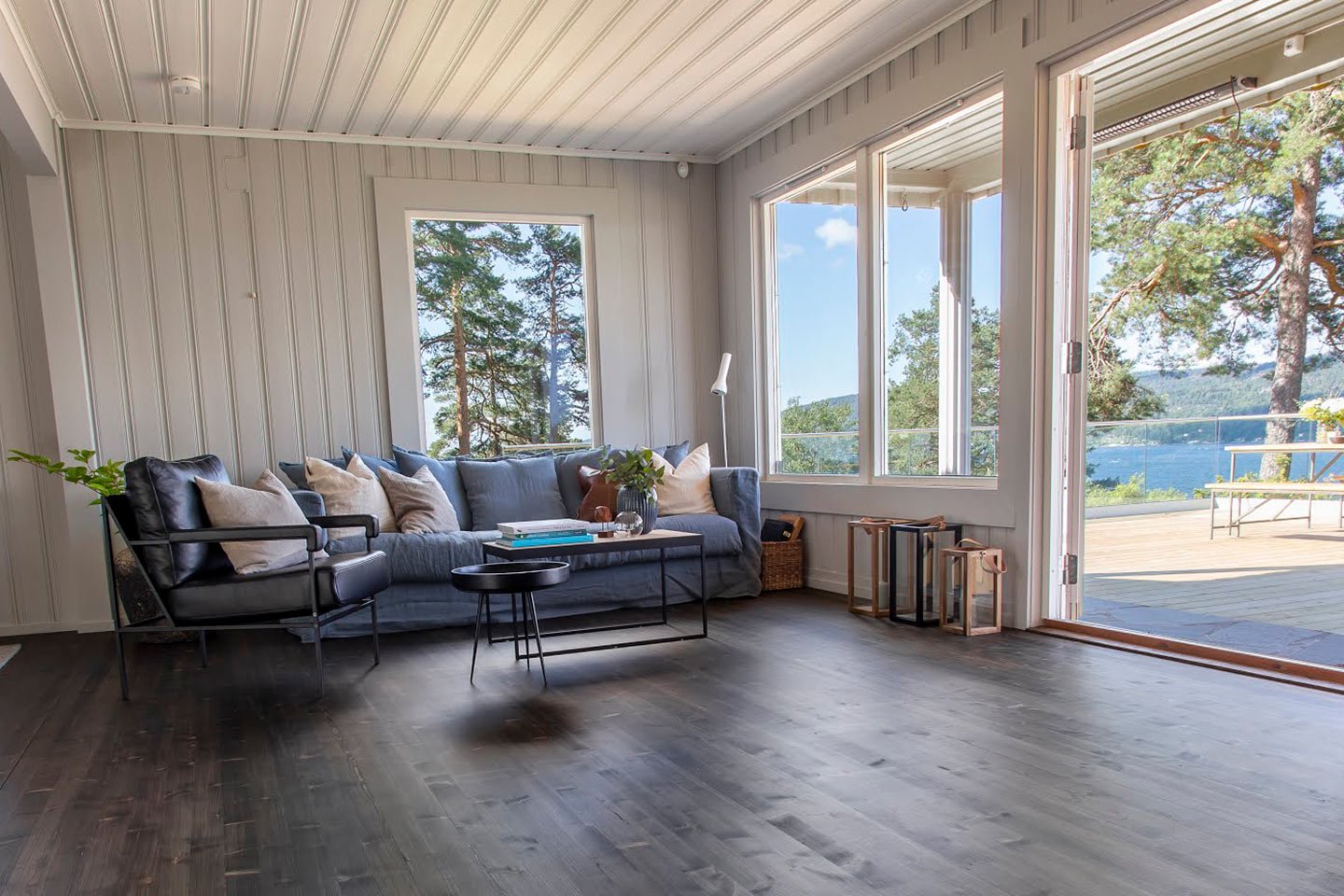I dag er den tidligere slitne hytta nesten ikke til å kjenne igjen: Terrassegulvet ute og stuegulvet inne har en relativt lik farge, slik at overgangen mellom ute og inne nærmest viskes ut. De mørke gulvene dominerer i stuen, men skaper en lun og trygg atmosfære.