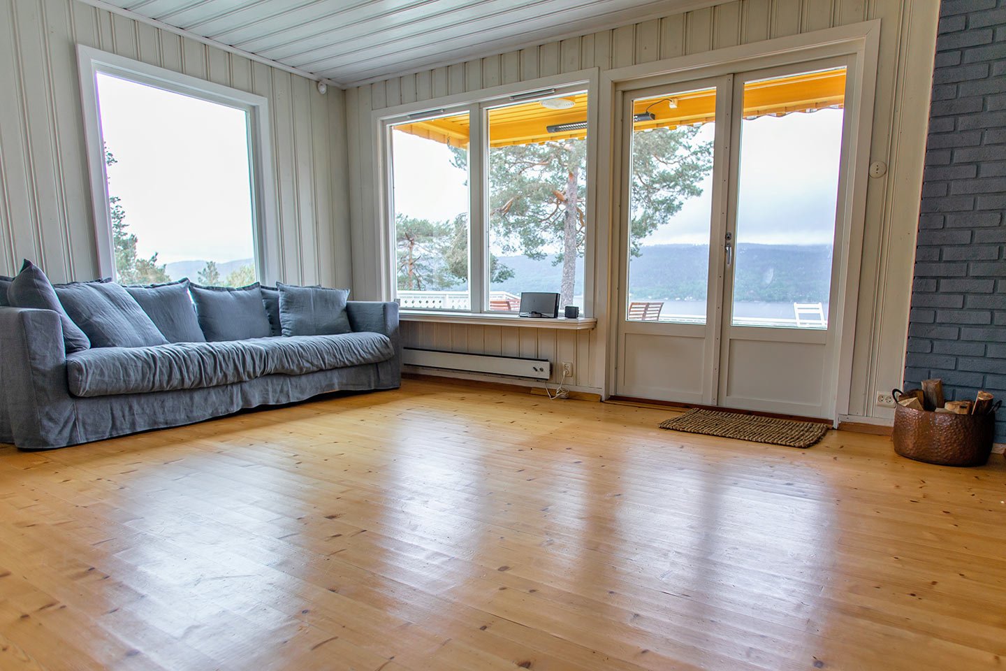 Stuen var preget av et gulnet gulv i furu med stort potensiale. Med en fantastisk havutsikt og direkte utgang til en flott uteplass, var det naturlig å fokusere på nettopp dette rommet tidlig i oppussingsprosessen.