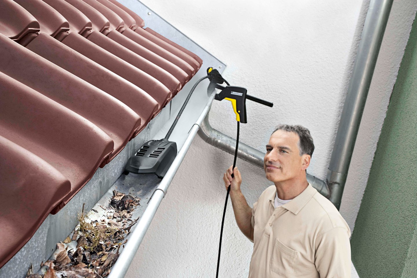 Et takrengjøringssett som kan kobles til høytrykkspyleren koster en tusenlapp. Da klatrer du opp i den ene enden av taket, slipper en liten "vaskemus" ned i takrenna. Den spyler takrenna effektivt. Med 20 meters slange sparer den deg for mange turer opp og ned i stigen.